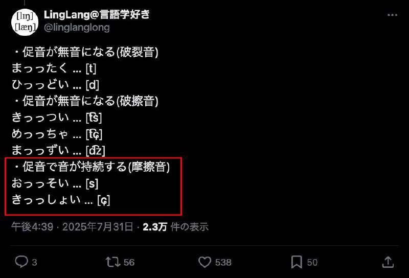 评论总结到只有后面跟的是摩擦音时,促音不会表现为完全的停顿,而是持续发后面的这个摩擦音